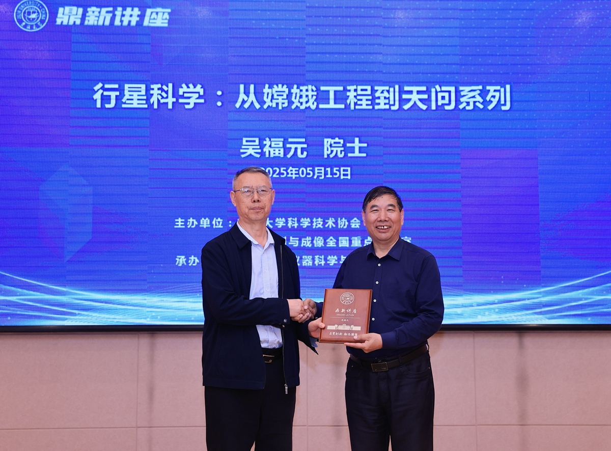 【文字/图片 徐立华】5月15日,作为第63届高等教育博览会“名师大家东北行”系列活动之一,中国科学院地质与地球物理研究所吴福元研究员做客吉林大学鼎新讲座,在朝阳校区图书馆以“行星科学:从嫦娥工程到天问系列”为主题,为师生带来了一场精彩纷呈的学术报告。吉林大学地学部学部长林君教授出席并为吴福元颁授鼎新讲座纪念牌。讲座由地球科学学院院长单玄龙主持。